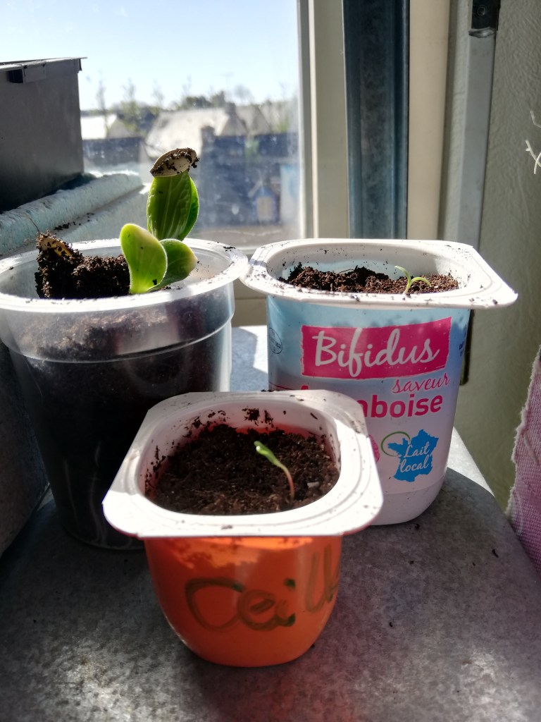 Quelques graines (ici salade, courge, tomates) des pots de yaourts et du terreau tout simplement vous permettrons de voir sortir de terre des petits plans. Si vous avez une étagère à disposition orientée sud ou ouest de préférence ce sera parfait.Une occupation réjouissante en ces temps de confinement qui nous offre une petite connexion avec la Nature. Prenez soin de vous