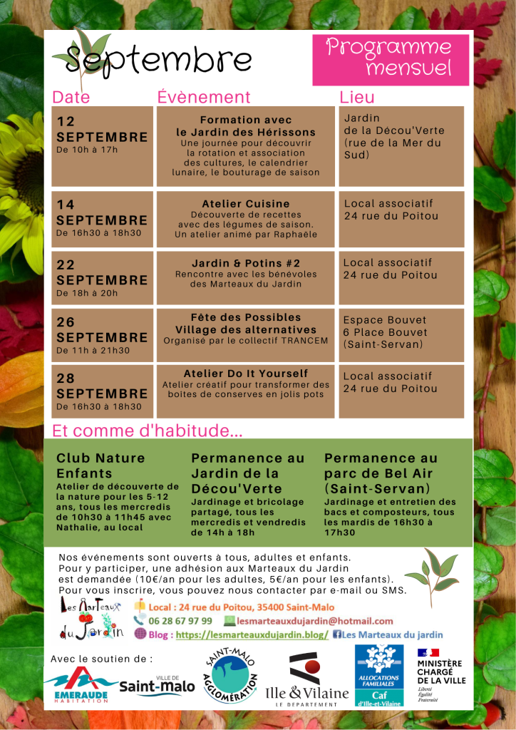 - Pour le moment, la Fête des Possibles est toujours prévue le 26 septembre prochain à l’espace Bouvet. Organisé par le collectif TRANCEM, cet événement a pour but de faire découvrir une trentaine d’associations malouines, dont les Marteaux du Jardin. Nous cherchons des volontaires pour nous aider à tenir le stand. Si vous êtes intéressé.e, écrivez-nous !
