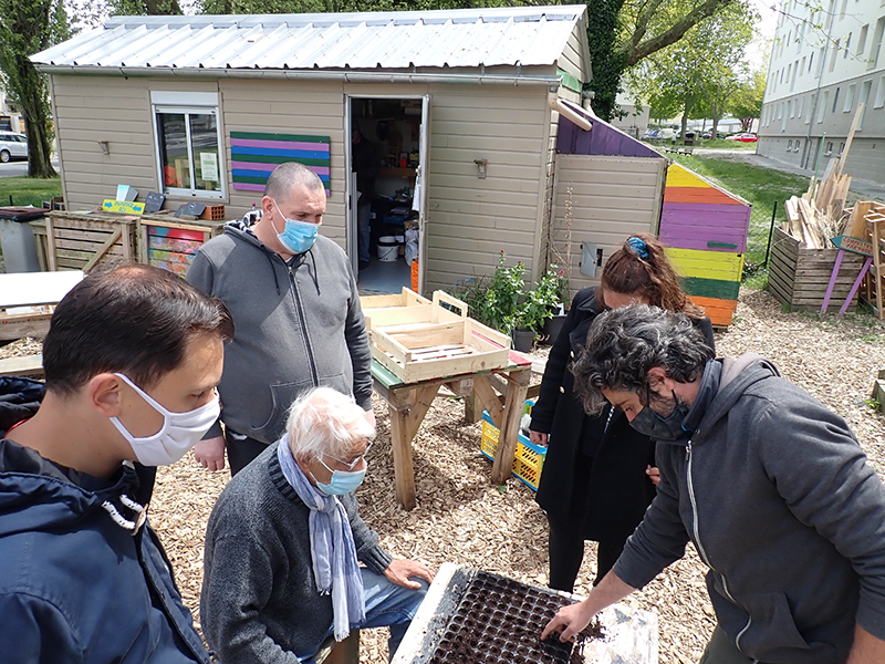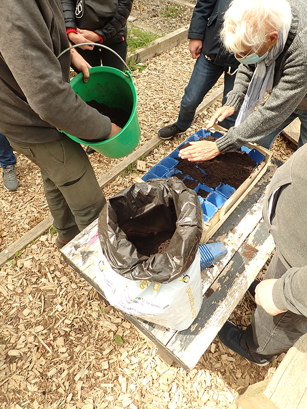 - Réalisation de semis sur plaques alvéolées avec notre nouvel animateur-maraîcher Tony : salades, cosmos, œillets d’Inde, Ipomée…