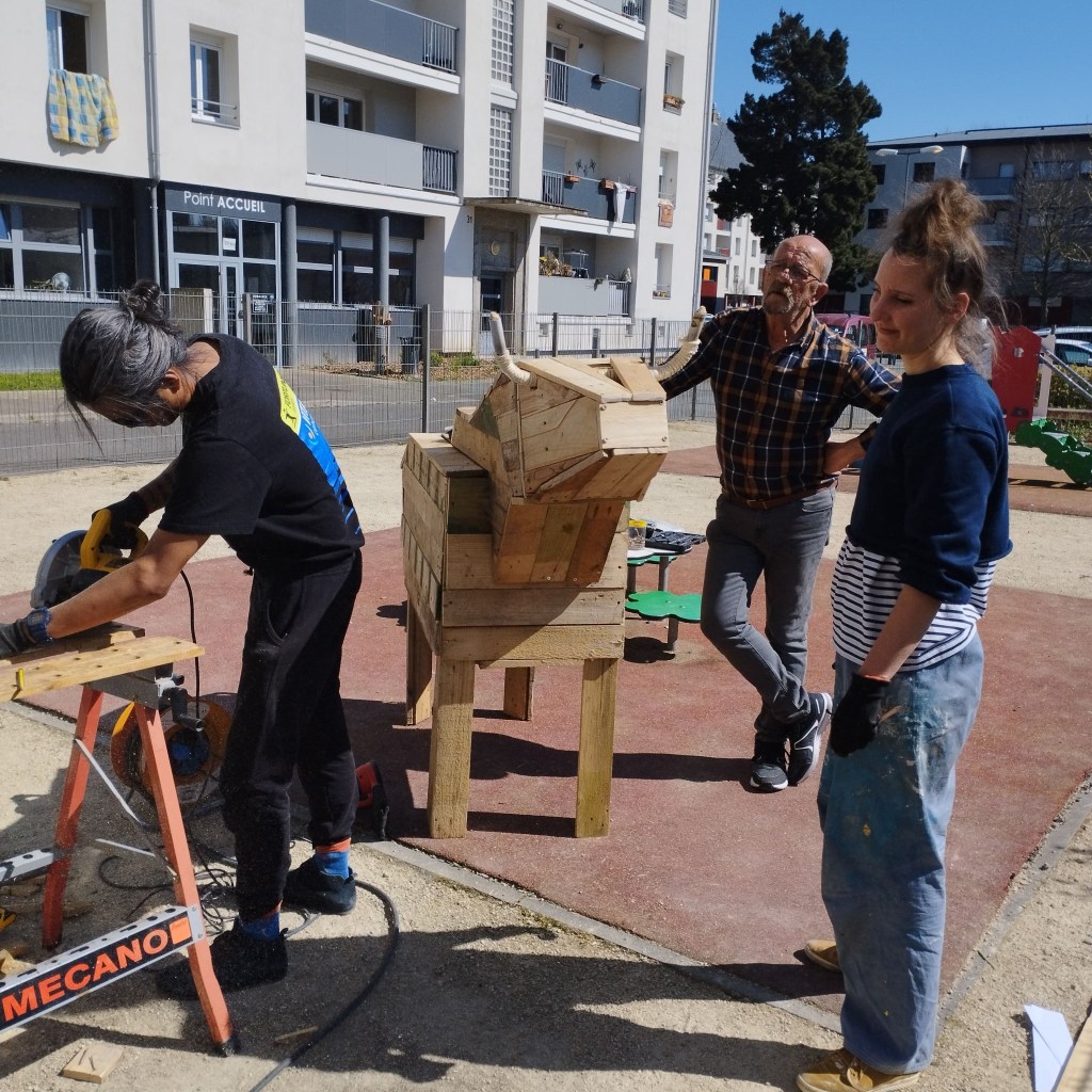 Construction d’une vache en palette pour accompagner les plantations – Par les artistes Anne et Bonarak BY et les habitants.