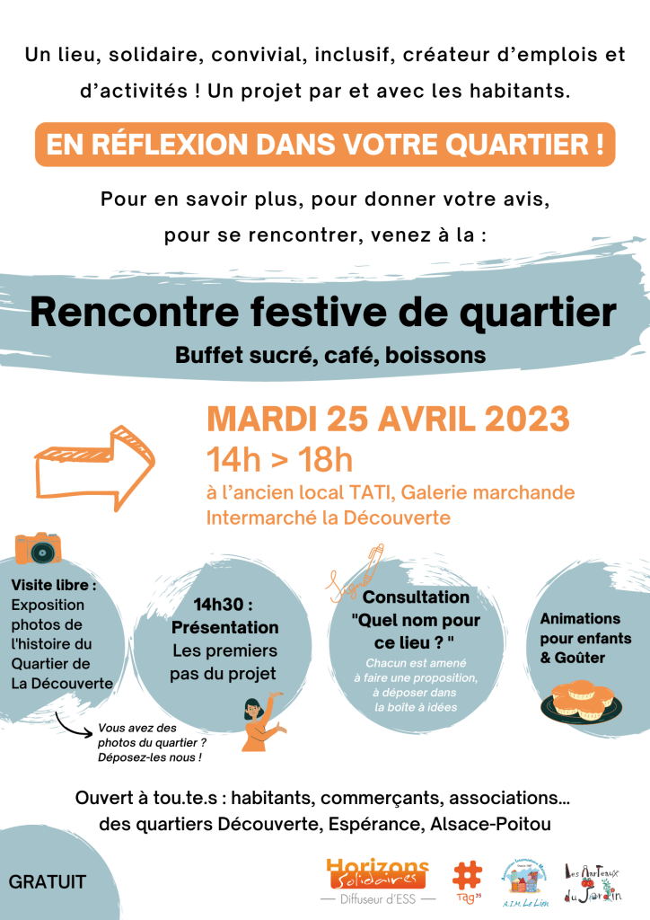 | Avec Horizons Solidaires, TAg35 et l’association Le Lien, nous vous convions à une rencontre festive de quartier pour discuter projet : projet d’un lieu solidaire, convivial, inclusif, créateur d’emplois et d’activités ! Pour dynamiser le quartier de La Découverte de façon collective 😊 ➡️➡️➡️ Réservez donc votre mardi 25 avril ! |