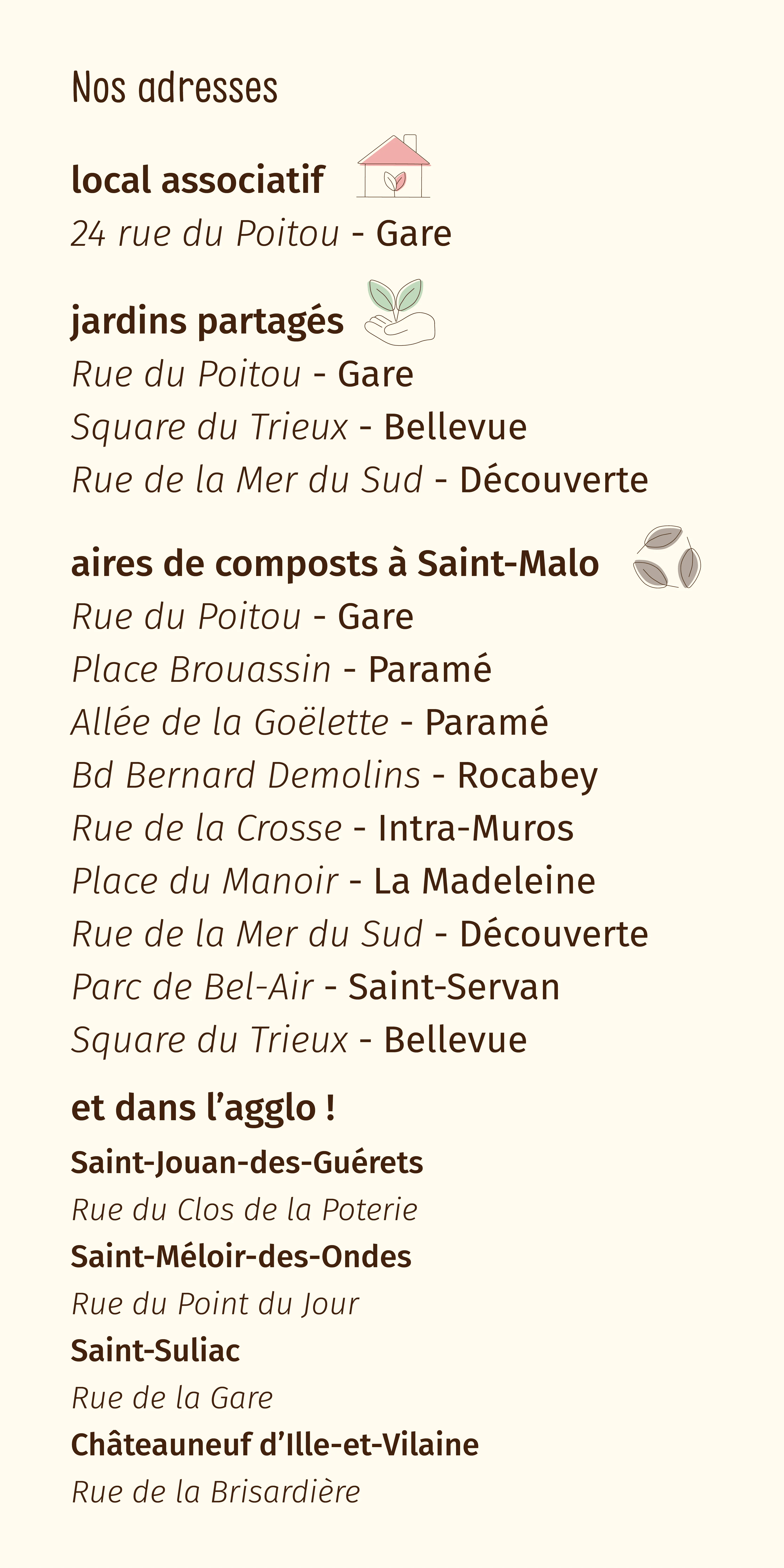Plusieurs espaces de jardinage, en bacs ou en pleine terre, ont été initiés depuis 2015. Ils sont aujourd’hui dispersés dans les différents quartiers de Saint-Malo. Ces lieux, une fois mis en place, vivent en priorité par et pour les habitants : la dynamique des lieux dépend de vous !